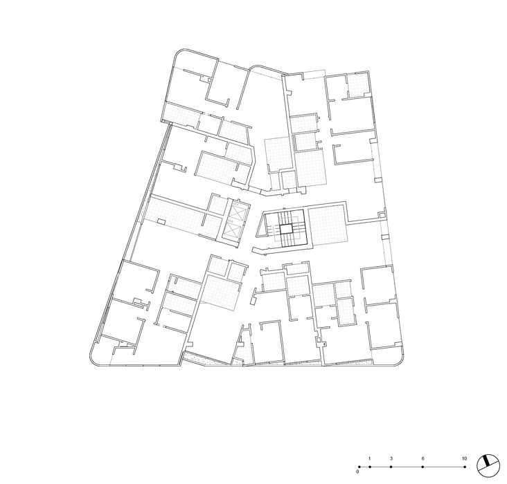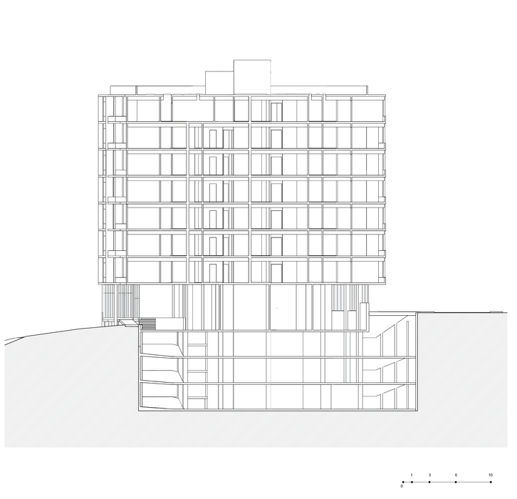 This eight-story residential building reshapes the streetscape by anchoring its base in a freely accessible public plaza and landscaped green area. The fully open ground plane draws pedestrians in, fostering a seamless link between the sidewalk, the new urban oasis, and the building’s interior communal life. The tower above rises as a lightweight volume that preserves sightlines while casting shade over the shared green space.