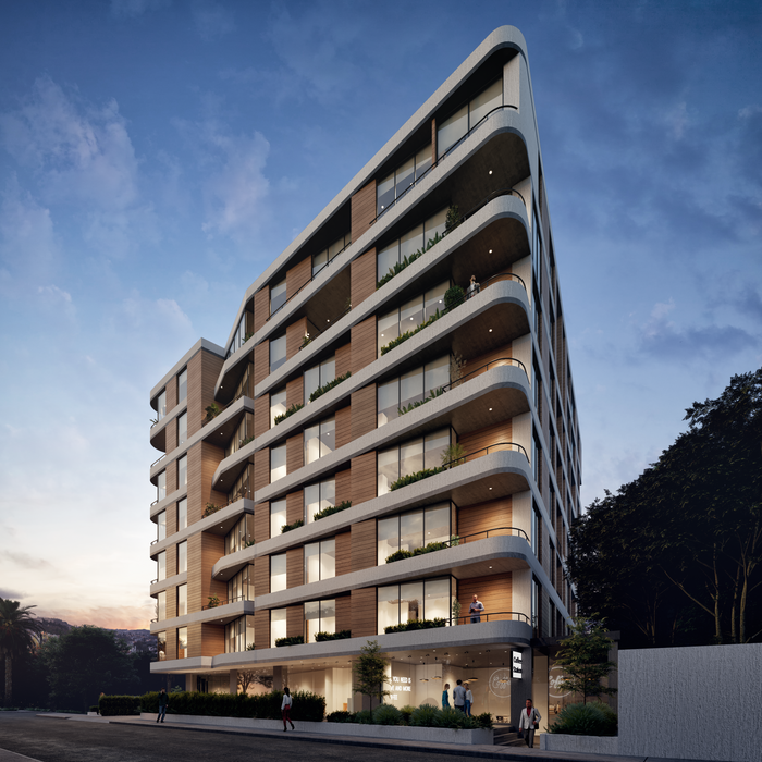 Este conjunto residencial de ocho pisos redefine el paisaje urbano al incorporar en su base una plaza pública ajardinada y un área verde de uso libre. El zócalo totalmente permeable invita al peatón a recorrer y apropiarse del espacio, estableciendo un vínculo fluido entre la calle, el nuevo pulmón vegetal y la vida interior del edificio. La volumetría en altura se presenta como un cuerpo ligero que se eleva sin obstruir visuales y, al mismo tiempo, genera sombra sobre el ágora verde.